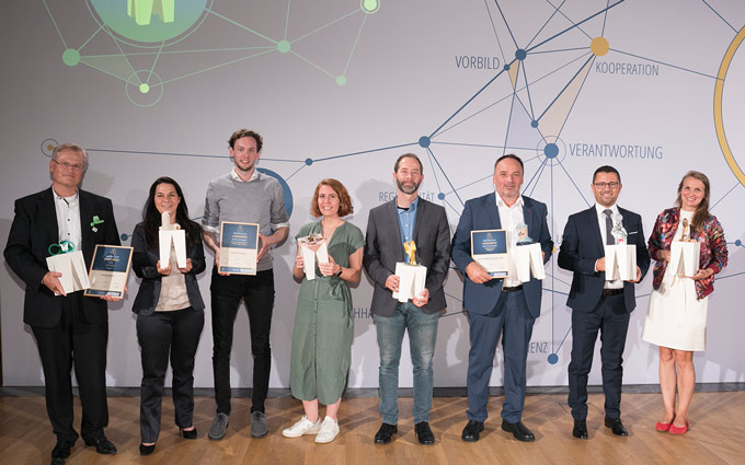 Gewinner 2021 v.l.n.r.: Reinhard Schneider von Werner & Mertz, Maria Bödecker von Reinsaat, Georg Strasser und Stefanie Krenn von Too Good To Go, Martin van Berkum von EVVA, Helmut Reckziegel von Greiner Packaging, Günter Redhammer von Fill und Marissa Florian von Plasticpreneur.